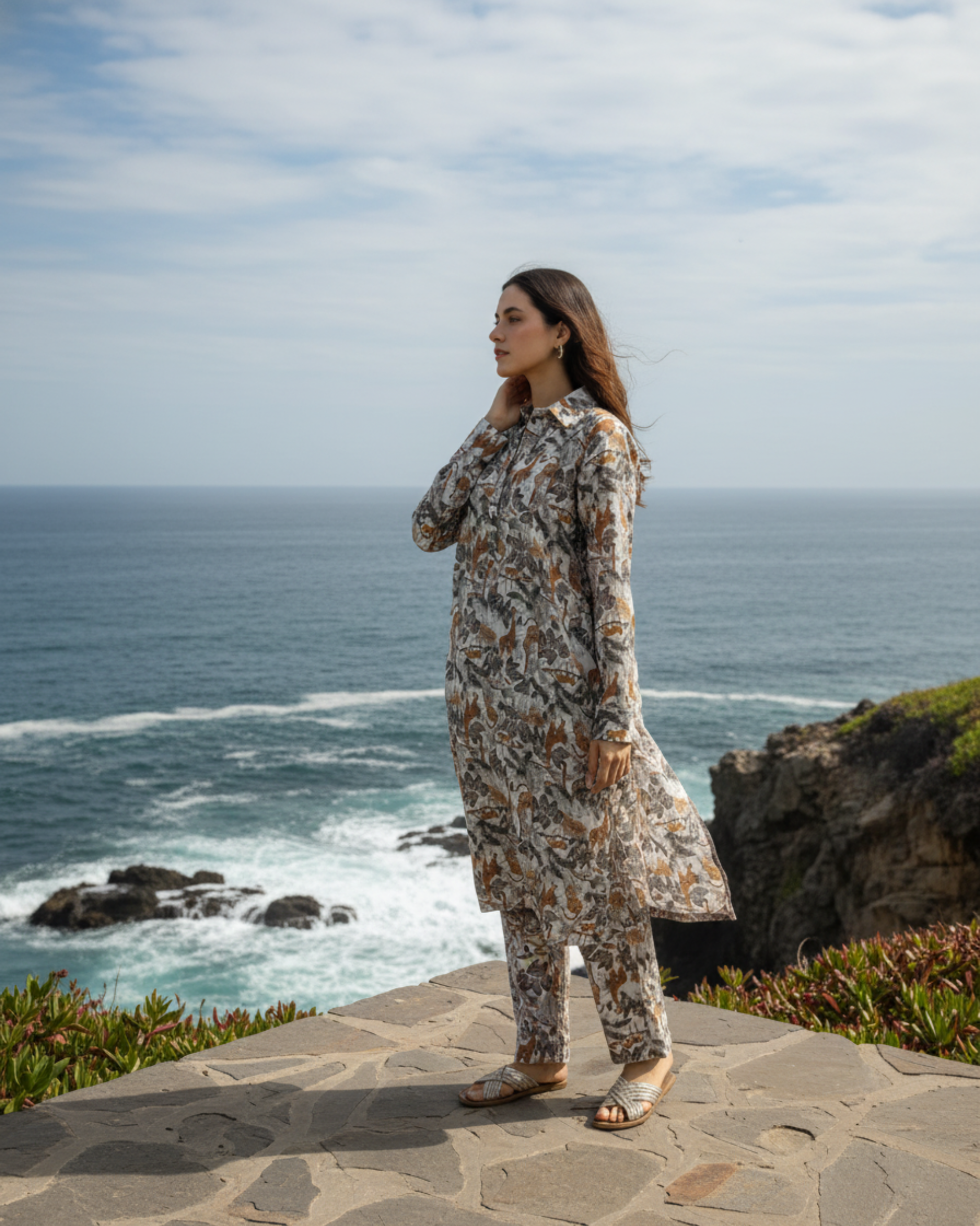 Safari Mid-Length Cotton Kurta Set – Off-White Print