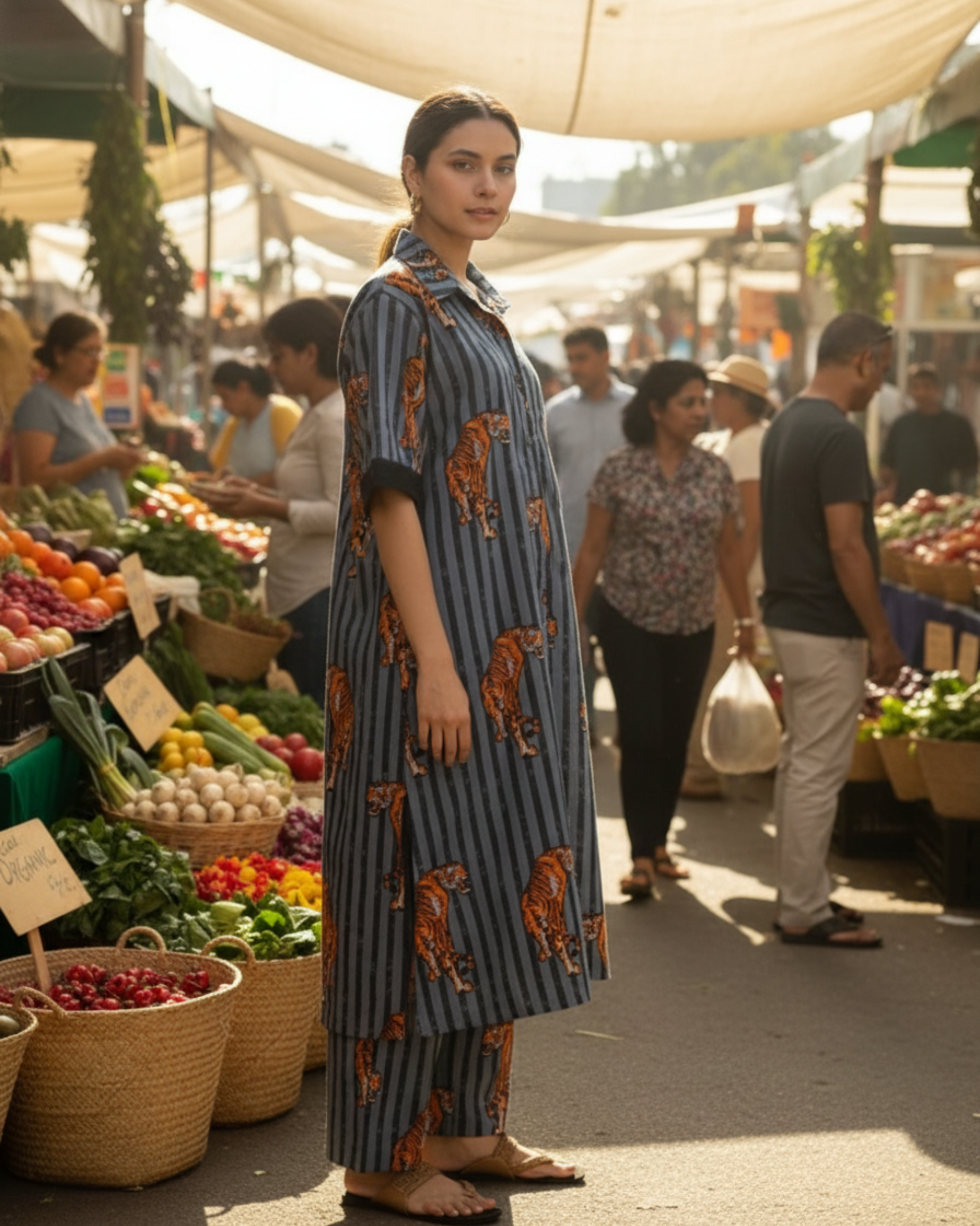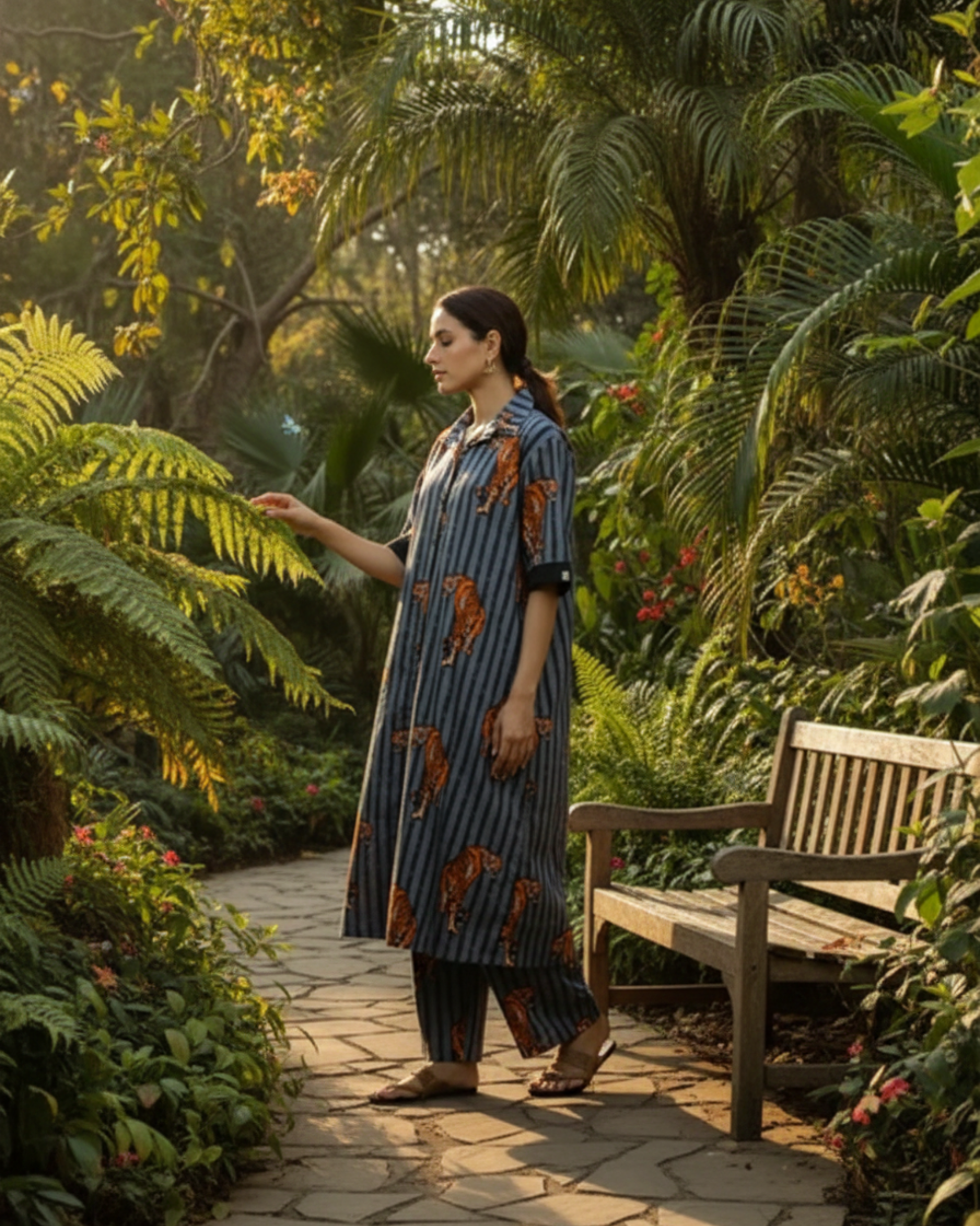 Wildrade Long Cotton Coord Set – Charcoal Tiger Print